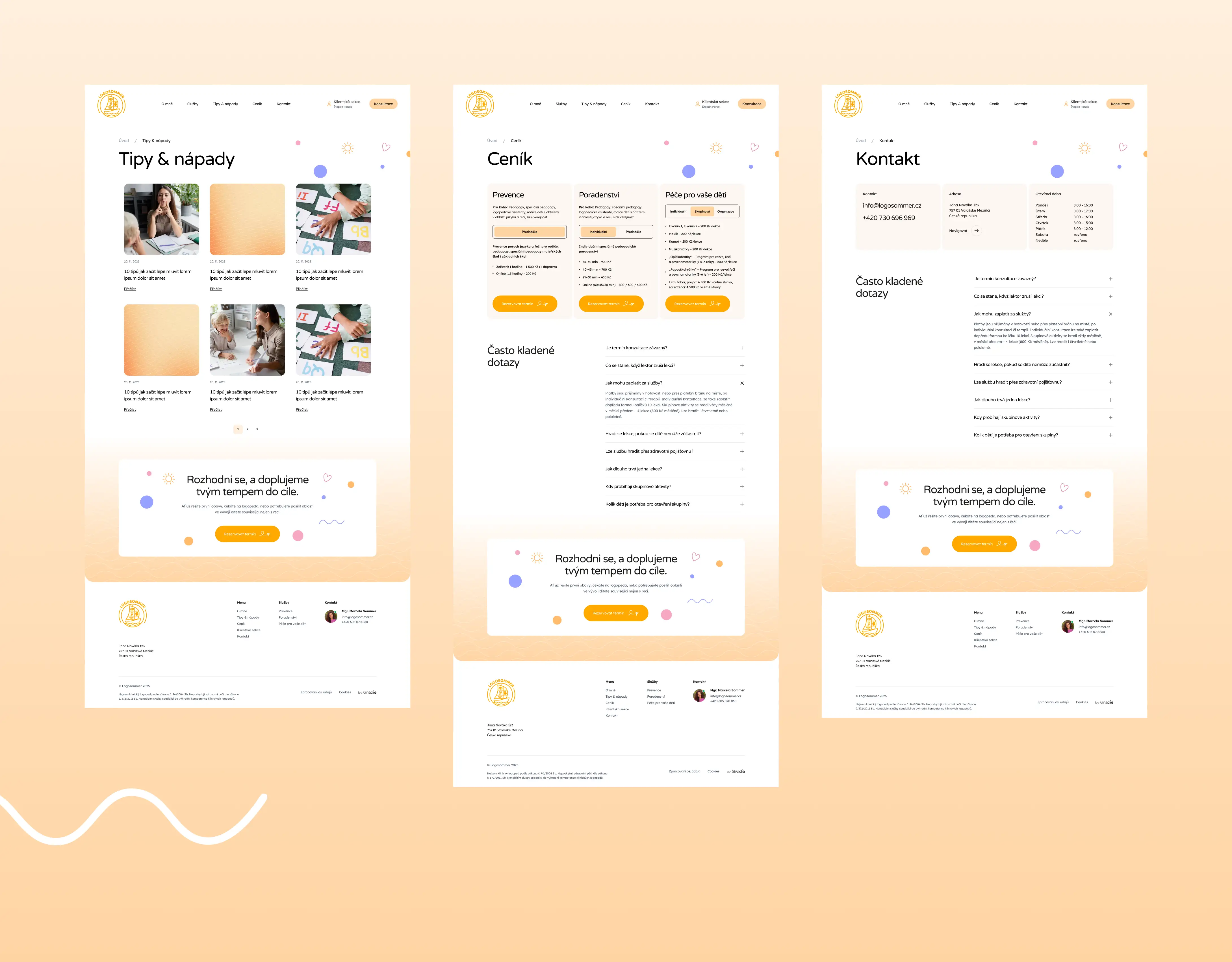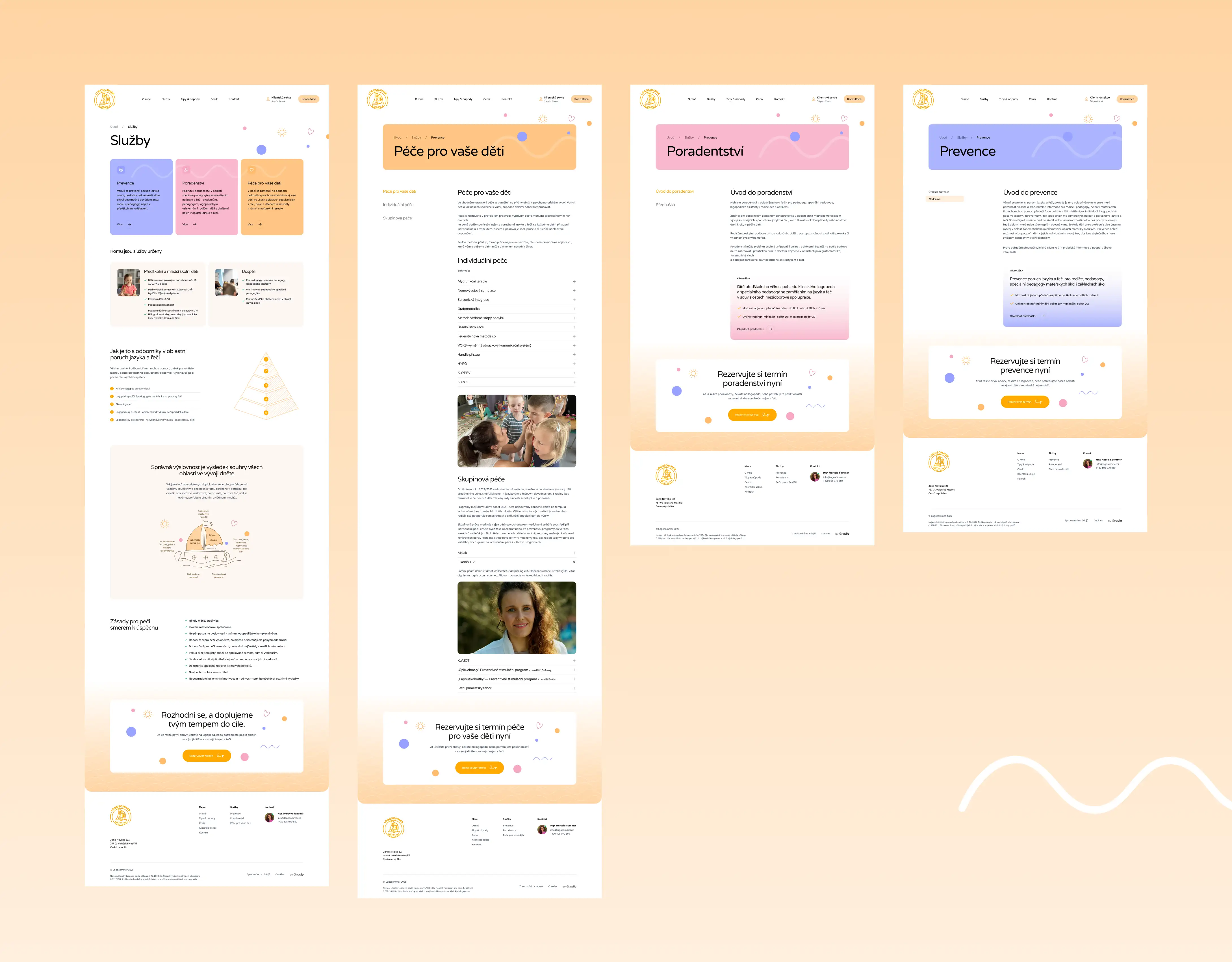 Branding pracuje s jemnými barvami, ilustrativními prvky a lehkostí, která pomáhá vytvořit bezpečné a srozumitelné prostředí pro návštěvníky webu. Design jsme postavili na jednoduché orientaci a jasné komunikaci služeb, aby rodiče rychle našli potřebné informace a cítili se na webu příjemně.